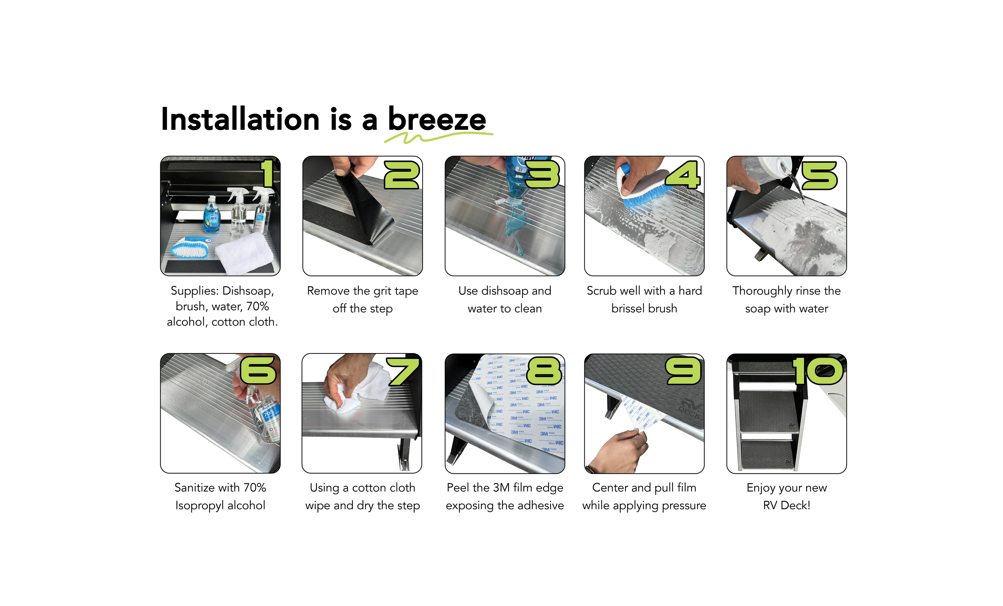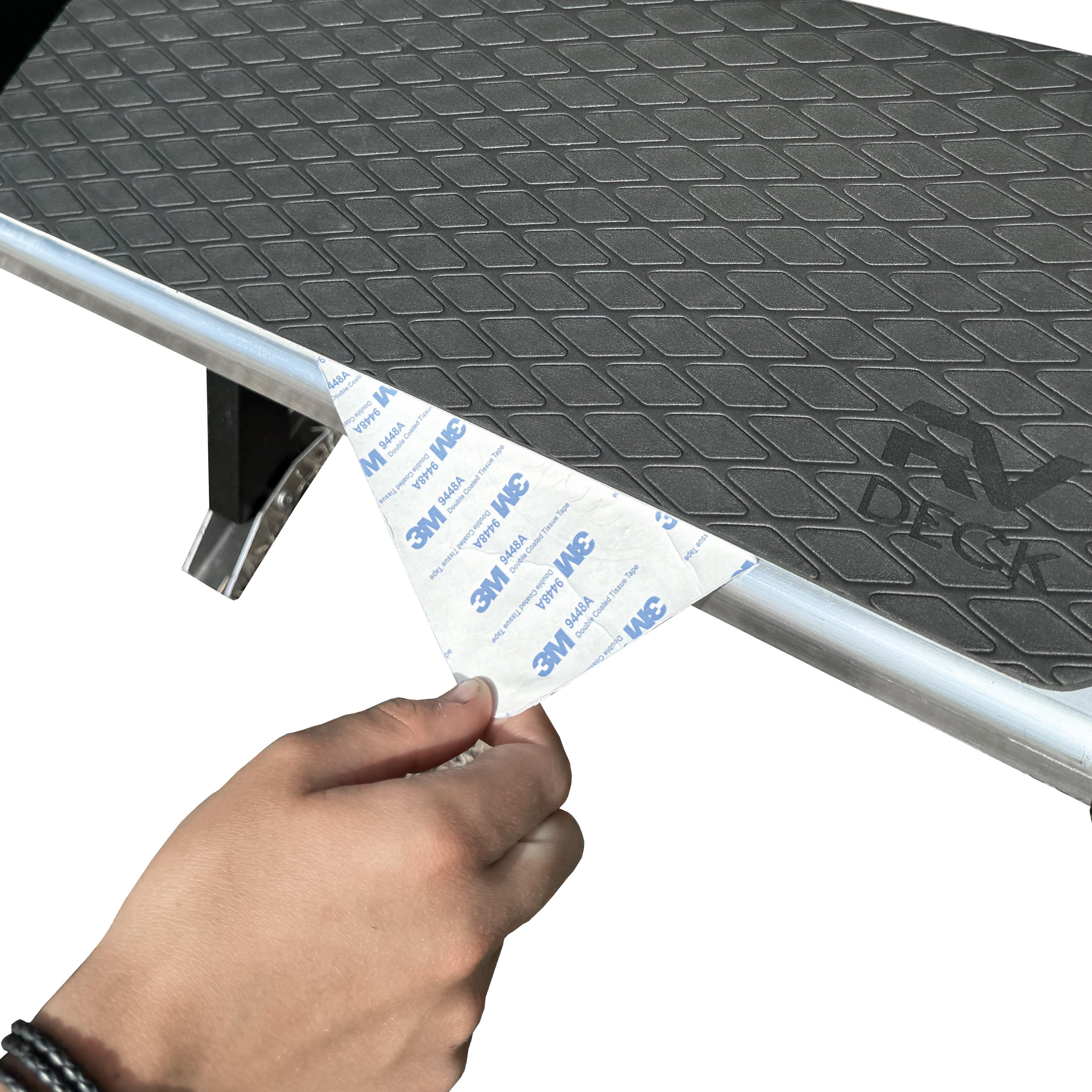Peel and stick makes installation a breeze. Just remove the existing grit tape, clean the step, remove the backing from your new RV Deck step mat, apply pressure and you are done.