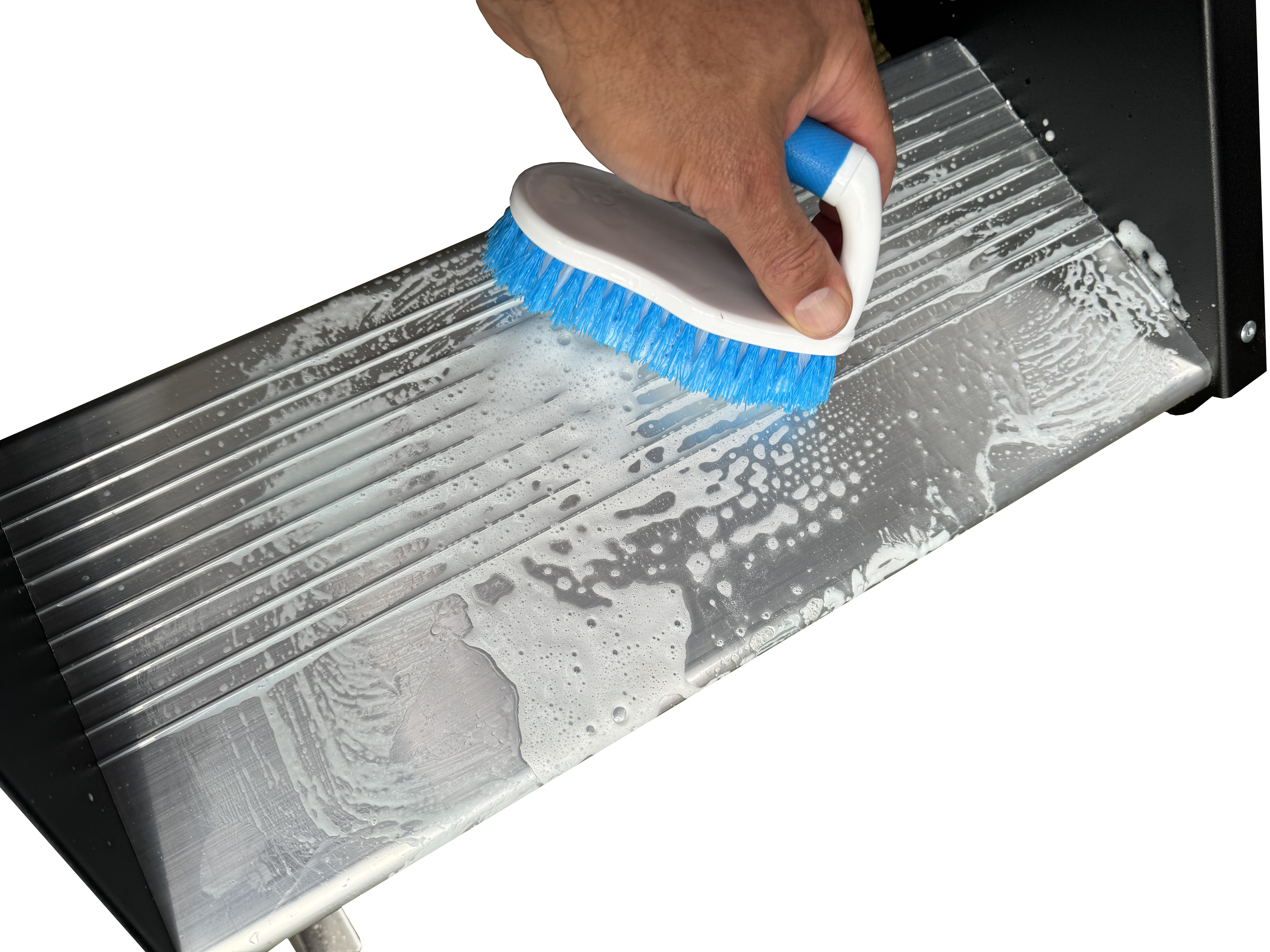 Use dish soap and water and scrub the step using a hard bristles brush. Wash the step thoroughly and ensure it is completely dry before proceeding with installation.