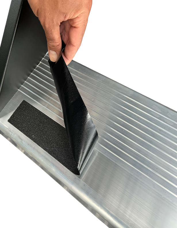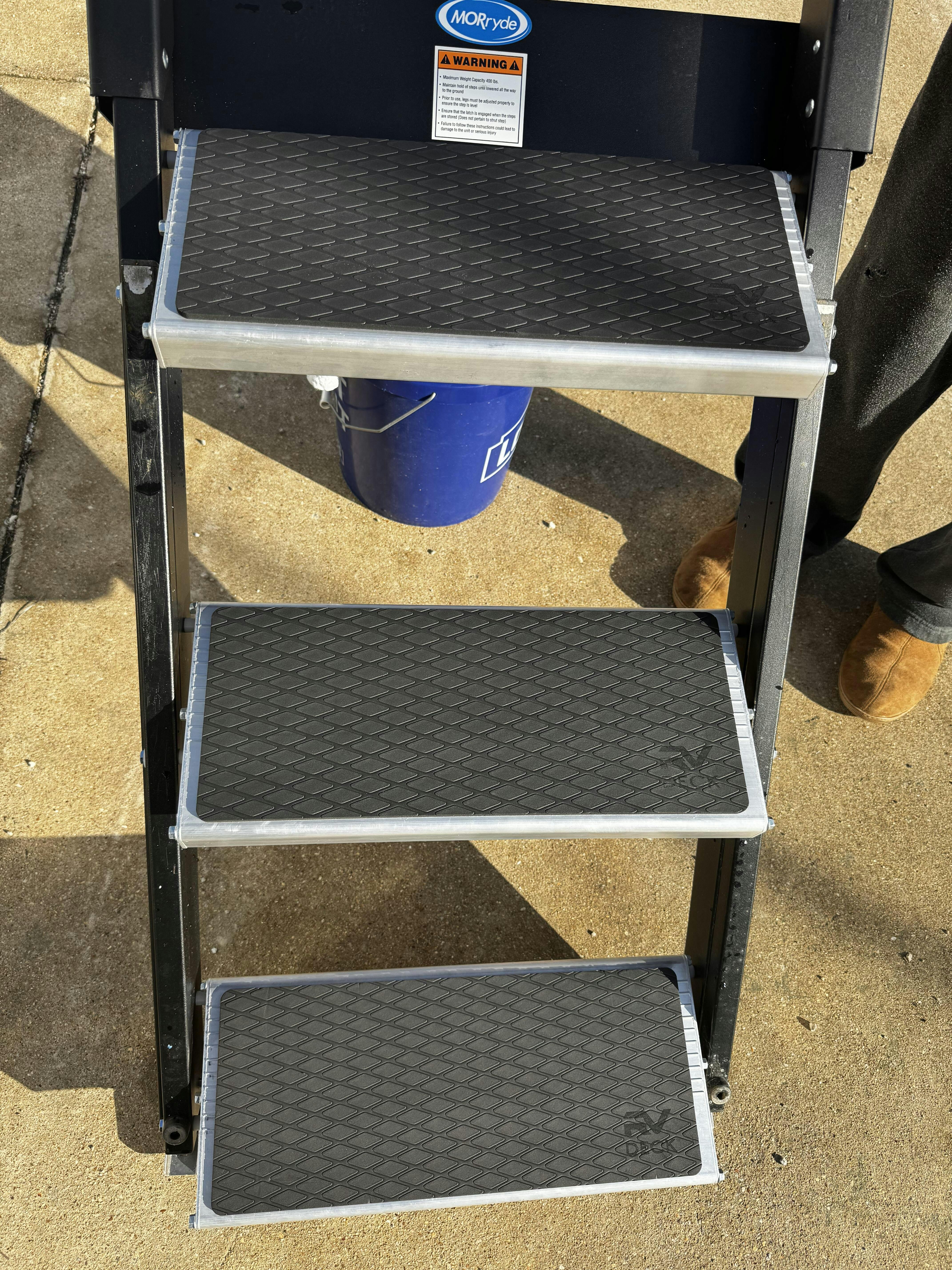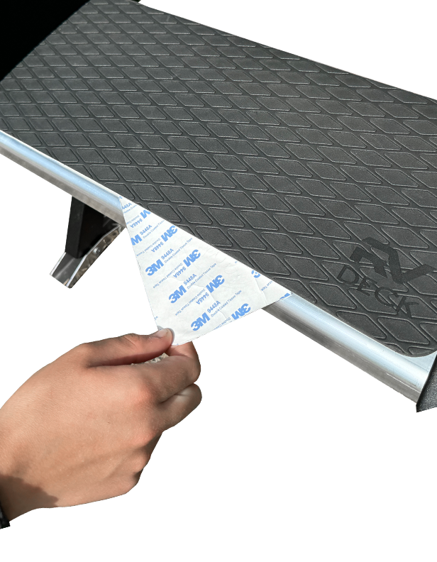 Peel and stick makes installation a breeze. Just remove the existing grit tape, clean the step, remove the backing from your new RV Deck step mat, apply pressure and you are done.